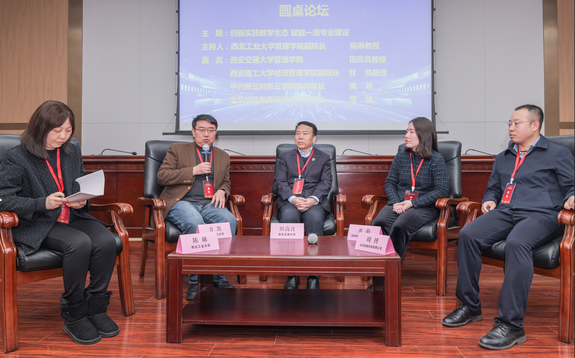 圓桌論壇由西北工業(yè)大學(xué)管理學(xué)院副院長(zhǎng)陳琳教授主持。特邀西安交通大學(xué)管理學(xué)院田高良教授、西安理工大學(xué)經(jīng)濟(jì)管理學(xué)院副院長(zhǎng)甘凱、中興新云財(cái)務(wù)云學(xué)院執(zhí)行院長(zhǎng)禹萌、北京知鏈教育研究院執(zhí)行院長(zhǎng)周博出席圓桌論壇,四位專家圍繞“創(chuàng)新實(shí)踐教學(xué)生態(tài),賦能一流專業(yè)建設(shè)”主題進(jìn)行了充分交流與討論。田高良教授分享了西安交通大學(xué)在實(shí)踐教學(xué)中的創(chuàng)新舉措,強(qiáng)調(diào)校企合作的重要性。甘凱副院長(zhǎng)分享了西安理工大學(xué)通過構(gòu)建多維度實(shí)踐教學(xué)體系,提升學(xué)生的綜合能力的創(chuàng)新實(shí)踐。禹萌院長(zhǎng)結(jié)合中興新云財(cái)務(wù)云學(xué)院的實(shí)踐,分享了財(cái)務(wù)數(shù)字化轉(zhuǎn)型背景下的人才培養(yǎng)路徑。周博院長(zhǎng)分享了北京知鏈教育研究院通過區(qū)塊鏈技術(shù)賦能實(shí)踐教學(xué),推動(dòng)教育模式的革新的做法。