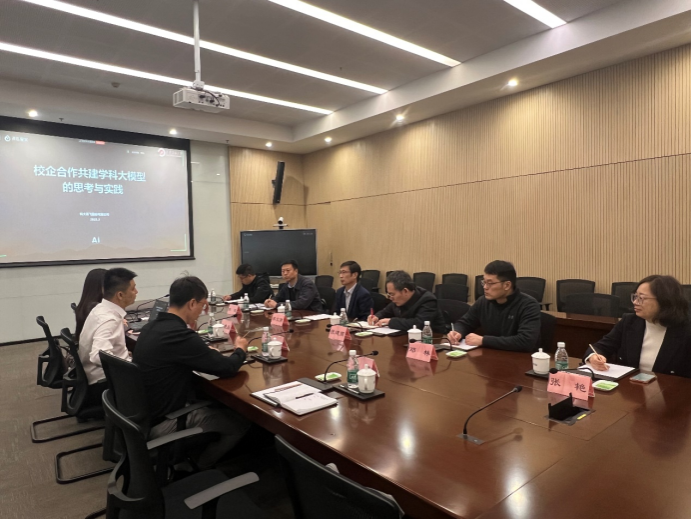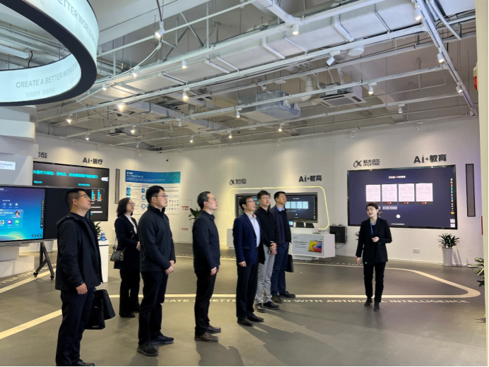 在科大訊飛絲路總部,蘇文甫一行首先參觀了人工智能展廳,深入了解了科大訊飛自創(chuàng)立以來(lái)的發(fā)展歷程,包括其在AI+教育、AI+產(chǎn)教融合、AI+聽(tīng)見(jiàn)、AI+醫(yī)療、AI+城市、AI+智能服務(wù)等多個(gè)領(lǐng)域的產(chǎn)品研發(fā)現(xiàn)狀。隨后,雙方圍繞校企合作模式、人工智能學(xué)科大模型開(kāi)發(fā)、人才培養(yǎng)及畢業(yè)生就業(yè)渠道等議題展開(kāi)了深入交流。