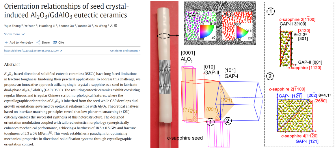近日,我校材料科學(xué)與工程學(xué)院鐘玉潔科研團(tuán)隊(duì)再次以西安石油大學(xué)為第一單位,在材料頂級(jí)期刊《Acta Materialia》(中科院一區(qū)TOP期刊,五年影響因子9.3)上發(fā)表研究論文《Orientation relationships of seed crystal-induced Al2O3/GdAlO3 eutectic ceramics》。