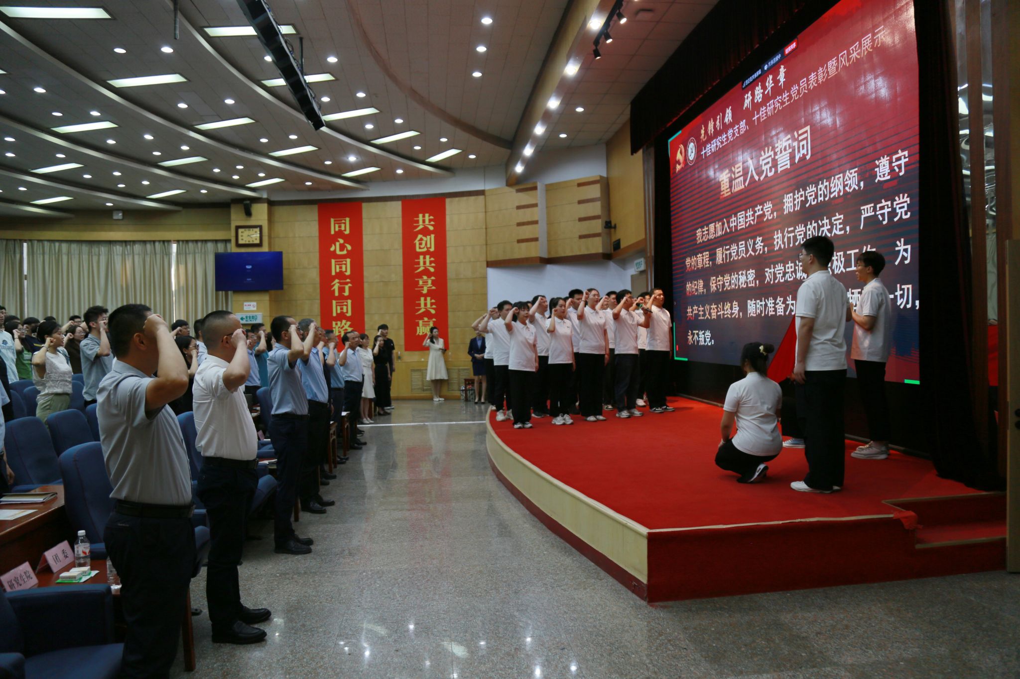 展示結(jié)束后,現(xiàn)場(chǎng)全體黨員在“雙十佳”研究生黨員的帶領(lǐng)下重溫入黨誓詞。大家舉起右拳,莊嚴(yán)宣誓,再一次用入黨誓詞洗滌心靈,激發(fā)為共產(chǎn)主義奮斗終生的昂揚(yáng)精神。