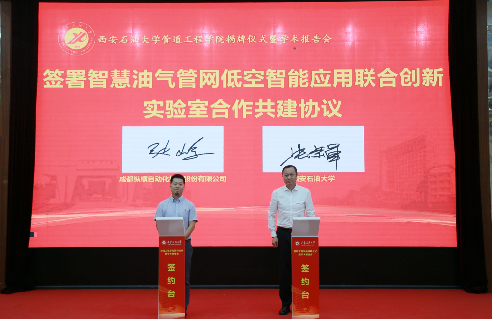 副校長(zhǎng)張榮軍與成都縱橫自動(dòng)化技術(shù)股份有限公司副總經(jīng)理張峻代表校企雙方簽署“智慧油氣管網(wǎng)低空智能應(yīng)用聯(lián)合創(chuàng)新實(shí)驗(yàn)室”合作共建協(xié)議。
