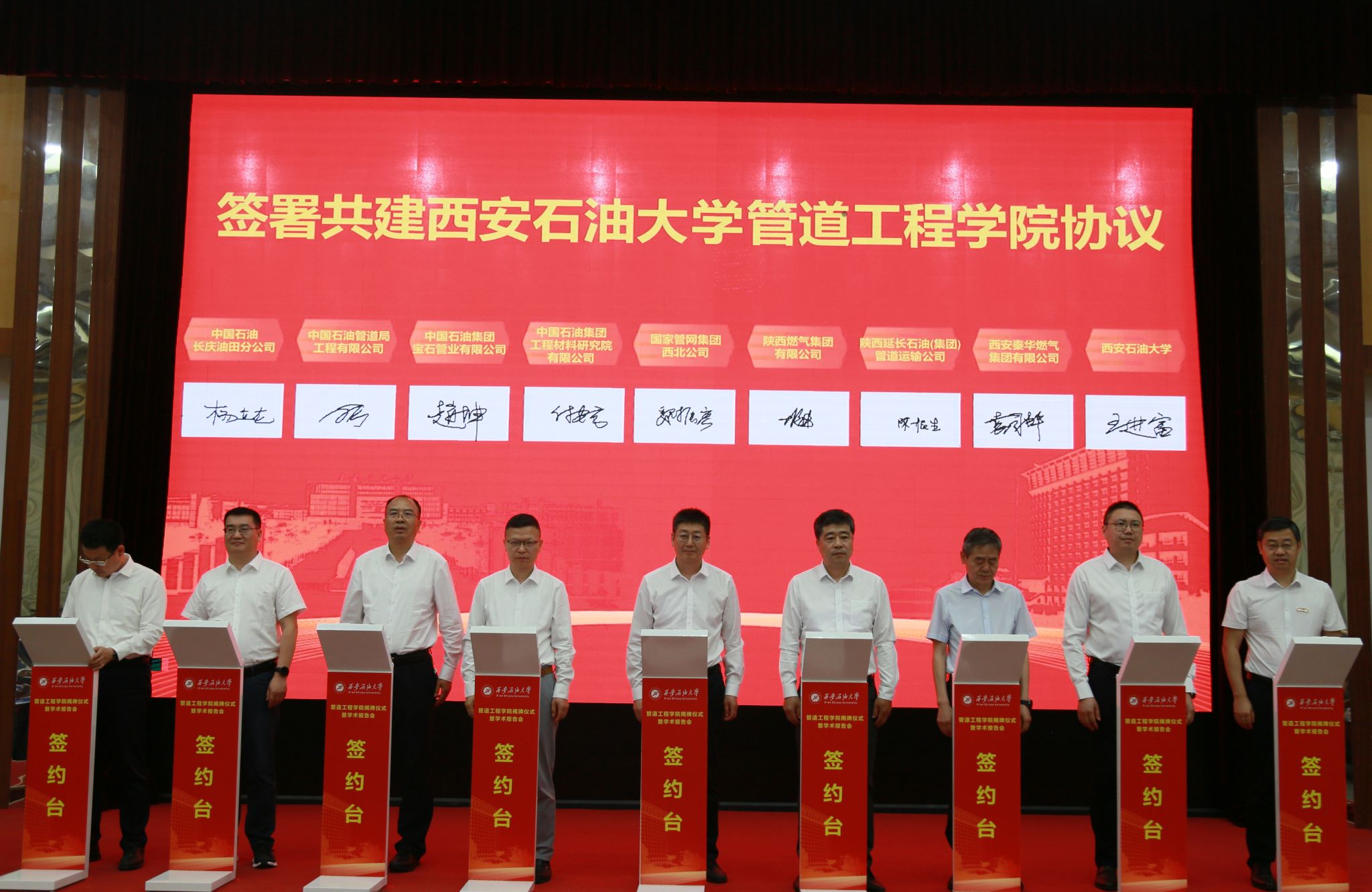 楊立龍副書(shū)記,劉廣仁副總經(jīng)理,趙坤首席專(zhuān)家,付安慶副總經(jīng)理,魏振宏副總經(jīng)理,胡恒進(jìn)總工程師,陳根生總監(jiān),袁國(guó)輝副總經(jīng)理,校長(zhǎng)王進(jìn)富共同簽署共建管道工程學(xué)院協(xié)議。