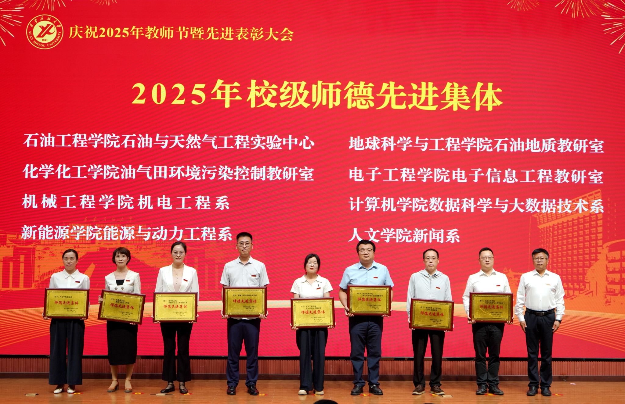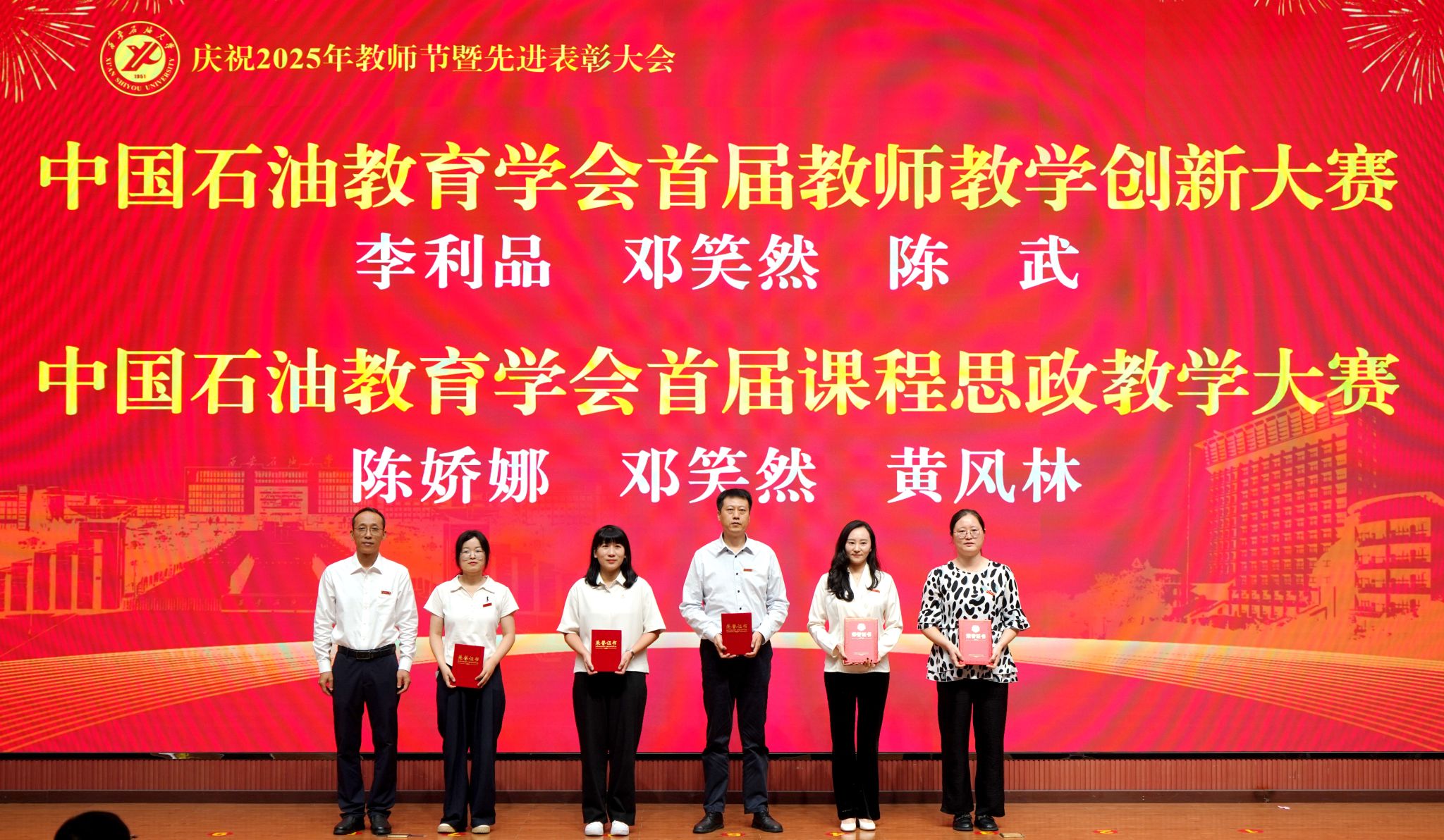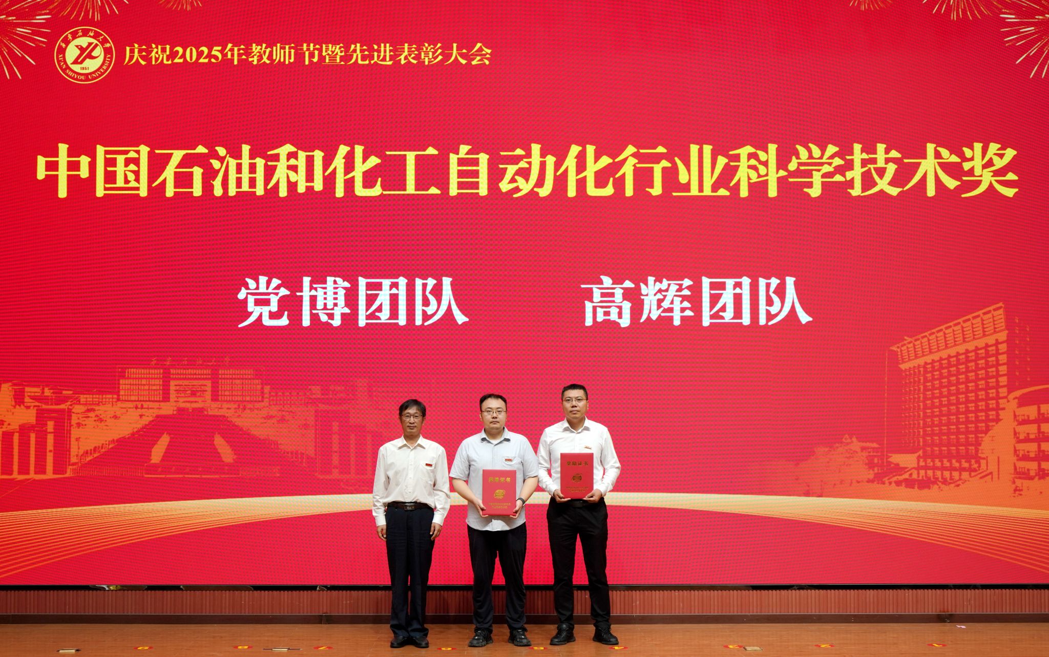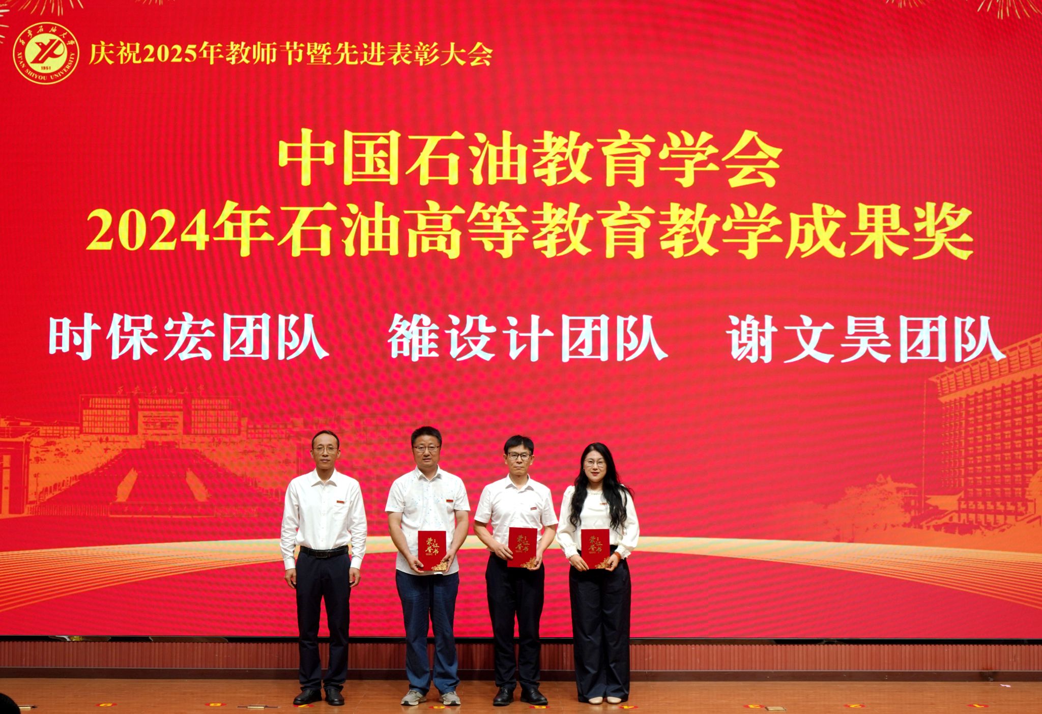 表彰大會(huì)在國(guó)歌聲中開(kāi)始,校領(lǐng)導(dǎo)宣讀表彰決定,并為受表彰教師代表頒發(fā)證書(shū)和獎(jiǎng)?wù)?。校黨委副書(shū)記張木宣讀2024年度陜西省科學(xué)技術(shù)進(jìn)步獎(jiǎng)、國(guó)家重大人才工程和國(guó)家青年人才工程入選名單;校黨委副書(shū)記、紀(jì)委書(shū)記、監(jiān)察專員王輝強(qiáng)宣讀陜西省高層次人才特殊支持計(jì)劃等人選名單;副校長(zhǎng)蘇文甫宣讀陜西高校優(yōu)秀青年人才支持計(jì)劃、陜西省“三秦博創(chuàng)”人才支持項(xiàng)目、中國(guó)石油和化工自動(dòng)化行業(yè)科學(xué)技術(shù)獎(jiǎng)獲獎(jiǎng)名單;副校長(zhǎng)張榮軍宣讀2025年陜西省科技計(jì)劃項(xiàng)目(第三批、第四批)、陜西省2023年高等教育教學(xué)成果獎(jiǎng)和陜西省第十三屆基礎(chǔ)教育教學(xué)成果獎(jiǎng)獲獎(jiǎng)名單;副校長(zhǎng)張君濤宣讀陜西省課程思政精品課程,中國(guó)石油教育學(xué)會(huì)2024年石油高等教育教學(xué)成果獎(jiǎng)、首屆教師教學(xué)創(chuàng)新大賽、首屆課程思政教學(xué)大賽獲獎(jiǎng)名單;副校長(zhǎng)張驍勇宣讀《中共西安石油大學(xué)委員會(huì)關(guān)于表彰2025年師德先進(jìn)集體和先進(jìn)個(gè)人的決定》;副校長(zhǎng)趙健宣讀《西安石油大學(xué)關(guān)于表彰獎(jiǎng)勵(lì)“教書(shū)育人30年”教師的決定》《中共西安石油大學(xué)委員會(huì) 西安石油大學(xué)關(guān)于表彰2025年優(yōu)秀教師、先進(jìn)教育工作者的決定》;副校長(zhǎng)種宇宏宣讀第21屆陜西青年五四獎(jiǎng)?wù)潞偷诙萌珖?guó)大學(xué)生職業(yè)規(guī)劃大賽陜西省決賽獲獎(jiǎng)名單,全體與會(huì)校領(lǐng)導(dǎo)為受表彰教師代表頒發(fā)證書(shū)和獎(jiǎng)?wù)隆?/p>