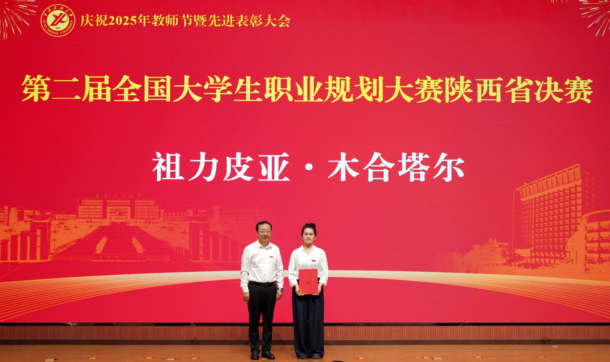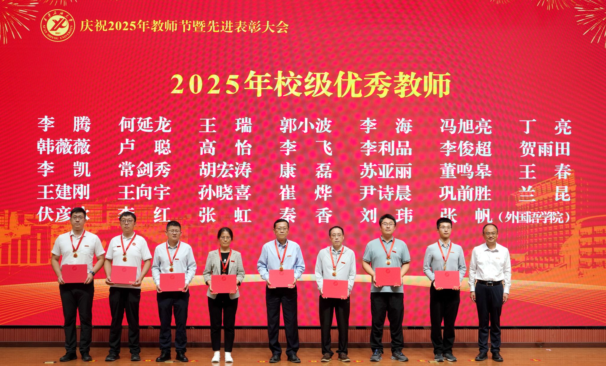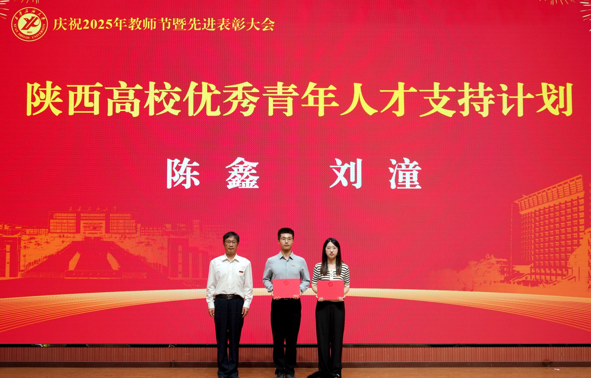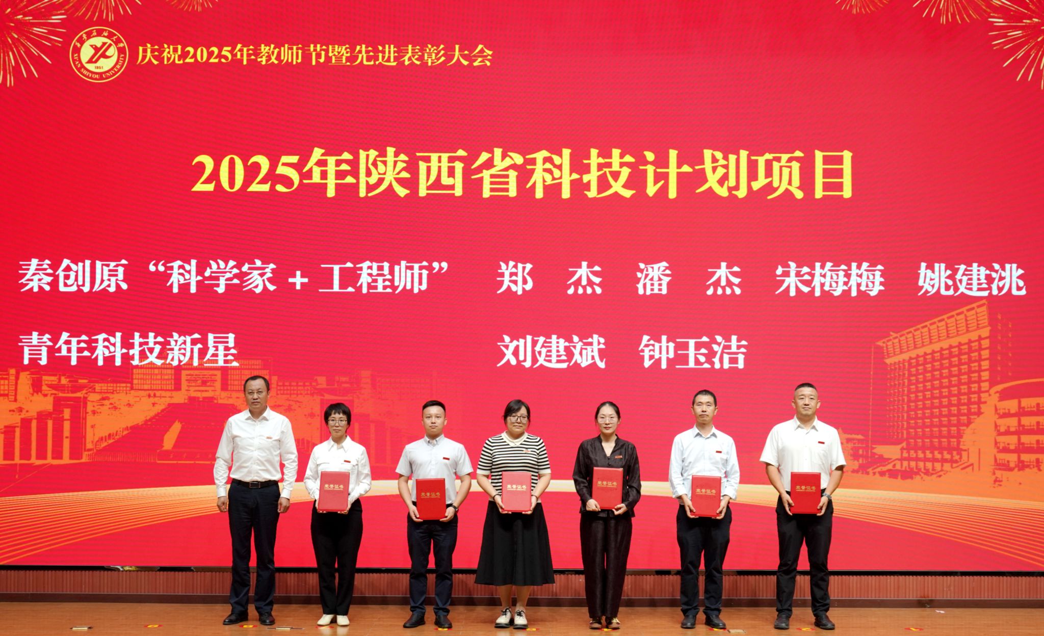 表彰大會(huì)在國(guó)歌聲中開(kāi)始,校領(lǐng)導(dǎo)宣讀表彰決定,并為受表彰教師代表頒發(fā)證書(shū)和獎(jiǎng)?wù)?。校黨委副書(shū)記張木宣讀2024年度陜西省科學(xué)技術(shù)進(jìn)步獎(jiǎng)、國(guó)家重大人才工程和國(guó)家青年人才工程入選名單;校黨委副書(shū)記、紀(jì)委書(shū)記、監(jiān)察專員王輝強(qiáng)宣讀陜西省高層次人才特殊支持計(jì)劃等人選名單;副校長(zhǎng)蘇文甫宣讀陜西高校優(yōu)秀青年人才支持計(jì)劃、陜西省“三秦博創(chuàng)”人才支持項(xiàng)目、中國(guó)石油和化工自動(dòng)化行業(yè)科學(xué)技術(shù)獎(jiǎng)獲獎(jiǎng)名單;副校長(zhǎng)張榮軍宣讀2025年陜西省科技計(jì)劃項(xiàng)目(第三批、第四批)、陜西省2023年高等教育教學(xué)成果獎(jiǎng)和陜西省第十三屆基礎(chǔ)教育教學(xué)成果獎(jiǎng)獲獎(jiǎng)名單;副校長(zhǎng)張君濤宣讀陜西省課程思政精品課程,中國(guó)石油教育學(xué)會(huì)2024年石油高等教育教學(xué)成果獎(jiǎng)、首屆教師教學(xué)創(chuàng)新大賽、首屆課程思政教學(xué)大賽獲獎(jiǎng)名單;副校長(zhǎng)張驍勇宣讀《中共西安石油大學(xué)委員會(huì)關(guān)于表彰2025年師德先進(jìn)集體和先進(jìn)個(gè)人的決定》;副校長(zhǎng)趙健宣讀《西安石油大學(xué)關(guān)于表彰獎(jiǎng)勵(lì)“教書(shū)育人30年”教師的決定》《中共西安石油大學(xué)委員會(huì) 西安石油大學(xué)關(guān)于表彰2025年優(yōu)秀教師、先進(jìn)教育工作者的決定》;副校長(zhǎng)種宇宏宣讀第21屆陜西青年五四獎(jiǎng)?wù)潞偷诙萌珖?guó)大學(xué)生職業(yè)規(guī)劃大賽陜西省決賽獲獎(jiǎng)名單,全體與會(huì)校領(lǐng)導(dǎo)為受表彰教師代表頒發(fā)證書(shū)和獎(jiǎng)?wù)隆?/p>