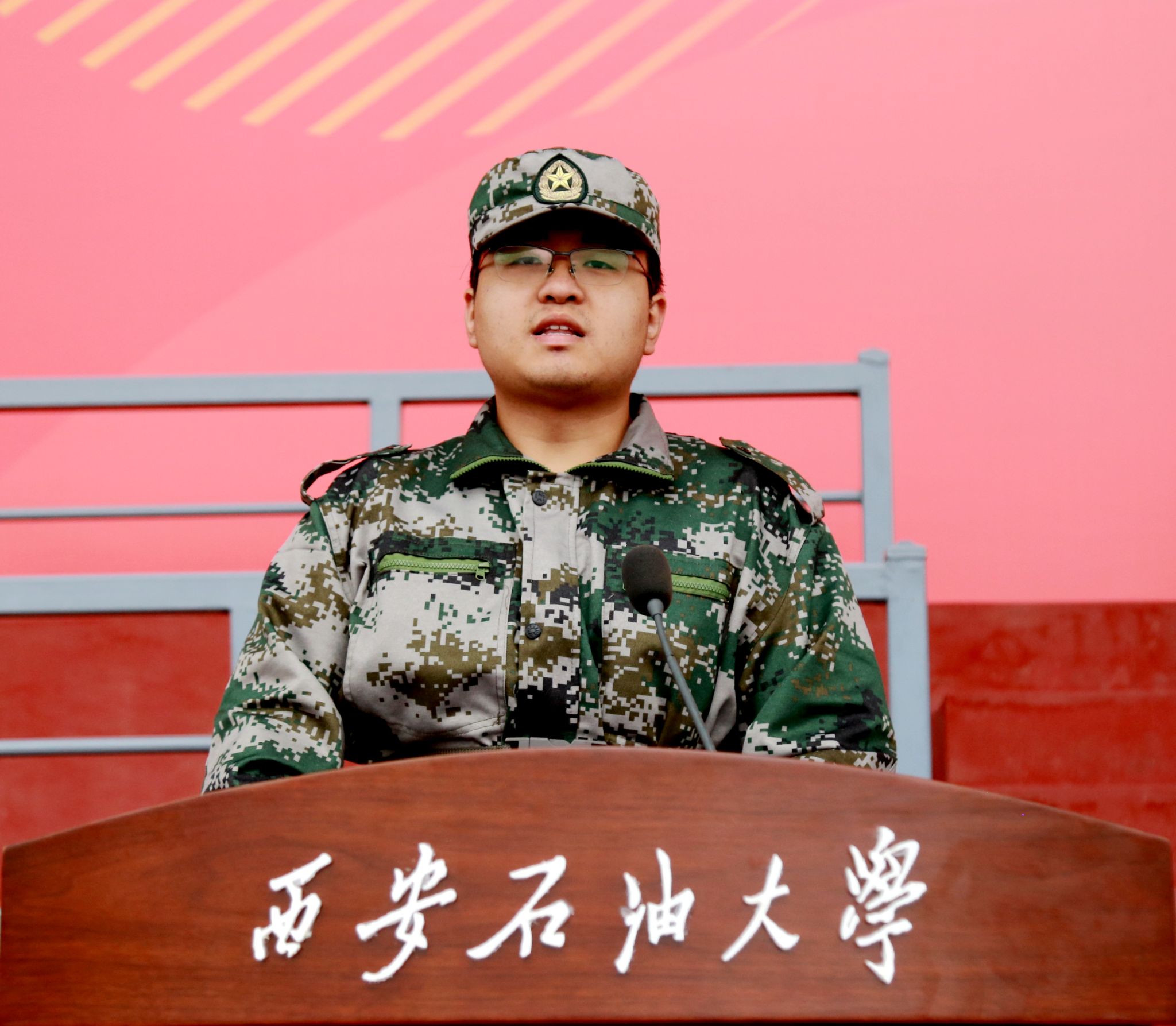 軍訓學員代表、三營七連、化學化工學院雷昌華同學代表參訓學生發(fā)言。他分享了自己主動撿拾場地垃圾,因而“撿”來了本次作為發(fā)言代表的機會,他號召全體同學在做好身邊小事的同時,要不斷發(fā)揚西石大人的朝氣與力量。