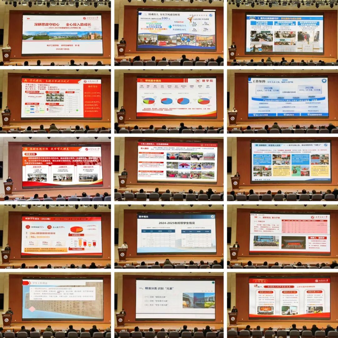 在院(系)匯報環(huán)節(jié),16個院(系)負責人依次登臺,圍繞本學年學生工作核心任務,從思想引領、學風建設、黨團建設、就業(yè)創(chuàng)業(yè)、心理健康、穩(wěn)定安全等關鍵維度,通過翔實數(shù)據與生動案例,全面總結工作成效,深刻剖析短板不足,并明確下一年度“補短板、創(chuàng)特色、提質效”的具體舉措。多個院(系)黨政負責人結合學科專業(yè)特色補充匯報,充分彰顯了院(系)協(xié)同聯(lián)動推進學生工作的良好格局。