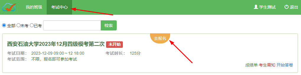 2、登錄成功后點擊“考試中心”,點擊對應(yīng)的場次“去報名”,填寫好自己的個人信息,點擊確定后即可報名成功,要保證個人信息無誤,避免影響成績。(班級填寫教學(xué)班,如B213)