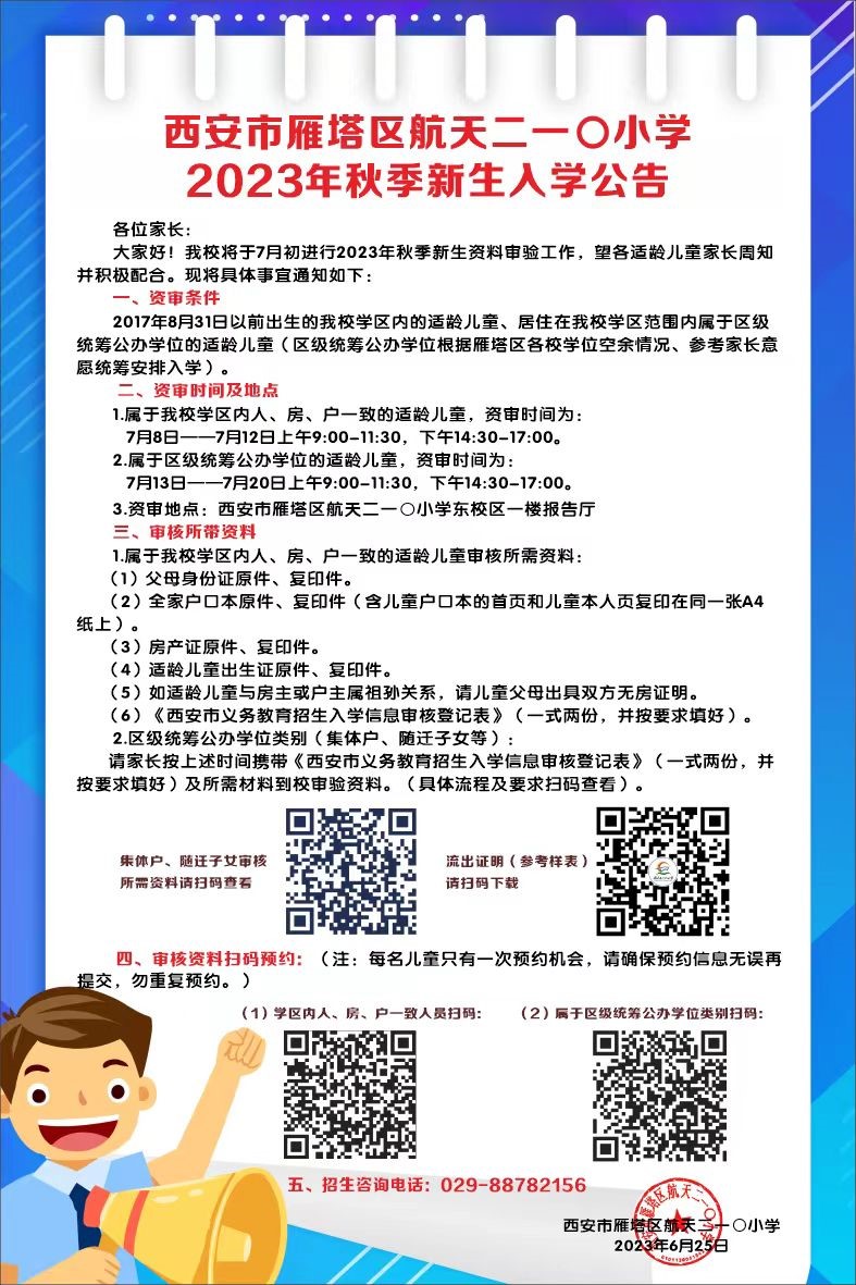 大家好!根據(jù)西安市雁塔區(qū)航天二一〇小學對轄區(qū)內(nèi)適齡兒童2023年秋季新生入學的通知安排,現(xiàn)將入學公告公布如下,請各位家長提前準備資料,按時進行資料審驗。