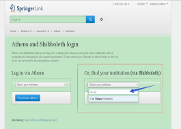 (3)選擇右邊的“ find your institute(via Shibboleth),點(diǎn)擊下拉框,在搜索框里面輸入shiyou,選擇Xi’an Shiyou University”,點(diǎn)擊 Log In Via Shibboleth。