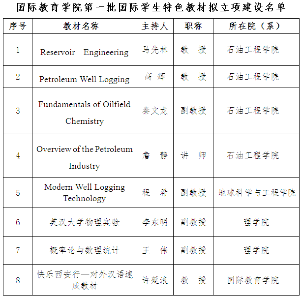 根據(jù)《西安石油大學(xué)關(guān)于開展國際學(xué)生特色教材立項建設(shè)的通知》要求,我院啟動了第一批校級國際學(xué)生特色教材立項建設(shè)工作。經(jīng)各院(系)教師申請、學(xué)院組織專家評審、學(xué)院院務(wù)會研究,決定將《Reservoir Engineering》等8部教材列為我院第一批國際學(xué)生特色教材擬立項建設(shè)項目。本批教材建設(shè)期限為2年,起止時間為2017年11月至2019年11月。屆時學(xué)院將組織驗收,驗收時教材主編須提供國家正式出版社出版教材1部。現(xiàn)將擬立項建設(shè)教材名單公示如下: