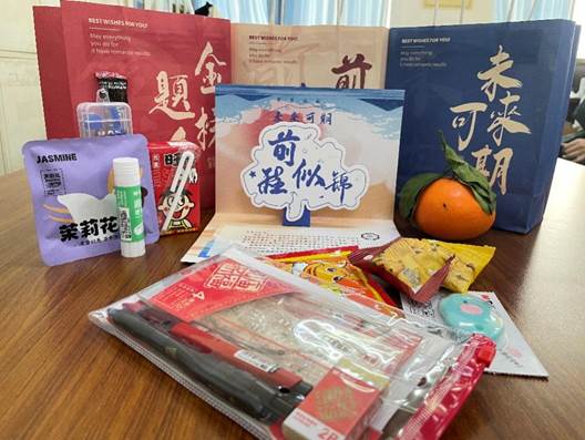 最后,學(xué)院為全體考研學(xué)生送上了精心準(zhǔn)備的“考研加油大禮包”,并和他們親切交流,為同學(xué)們提供復(fù)習(xí)建議,鼓勵大家要堅持努力,為實現(xiàn)夢想而奮斗。禮包中包含了“金”榜題名的文具袋、一“旺”到底的旺仔牛奶,心想事“橙”的臍橙、溫“暖”隨行的暖寶寶、“啡”你莫屬的咖啡等禮物,既實用又貼心。這份禮物不僅僅是物質(zhì)上的關(guān)懷,更是學(xué)院對學(xué)生們精神上的鼓勵和支持。