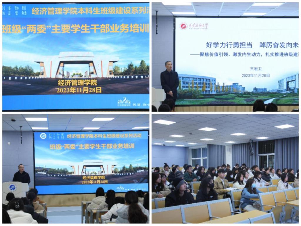 11月28日,經(jīng)濟(jì)管理學(xué)院班級“兩委”主要學(xué)生干部業(yè)務(wù)培訓(xùn)在鄠邑校區(qū)博覽樓110智慧大講堂開展,本次培訓(xùn)由經(jīng)濟(jì)管理學(xué)院黨委書記王宏衛(wèi)主講,黨委副書記王剛主持培訓(xùn)會,2021級、2022級、2023級班級“兩委”主要學(xué)生干部參加。