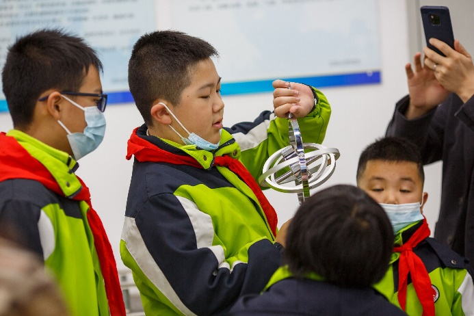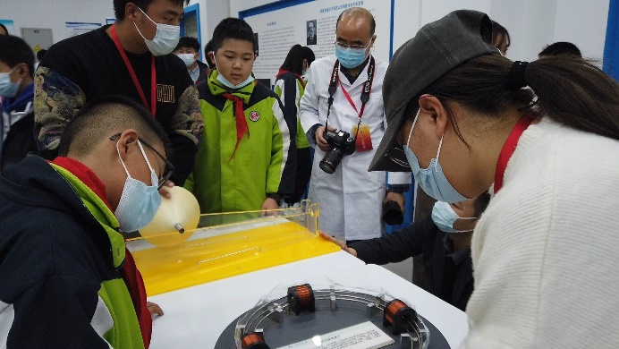在理學(xué)院物理演示中心,理學(xué)院教師和學(xué)生志愿者對演示實驗項目的原理、操作方法和注意事項進(jìn)行了詳細(xì)的講解和演示,引導(dǎo)代表團(tuán)的中小學(xué)生認(rèn)真觀察實驗現(xiàn)象、提出問題、主動探索,并指導(dǎo)大家親身體驗各個實驗項目。其中特斯拉放電、茹科夫斯基轉(zhuǎn)椅、錐體上滾、電磁炮、GPS全球定位系統(tǒng)演示儀、彩色影子等項目給學(xué)生們留下了深刻的印象。