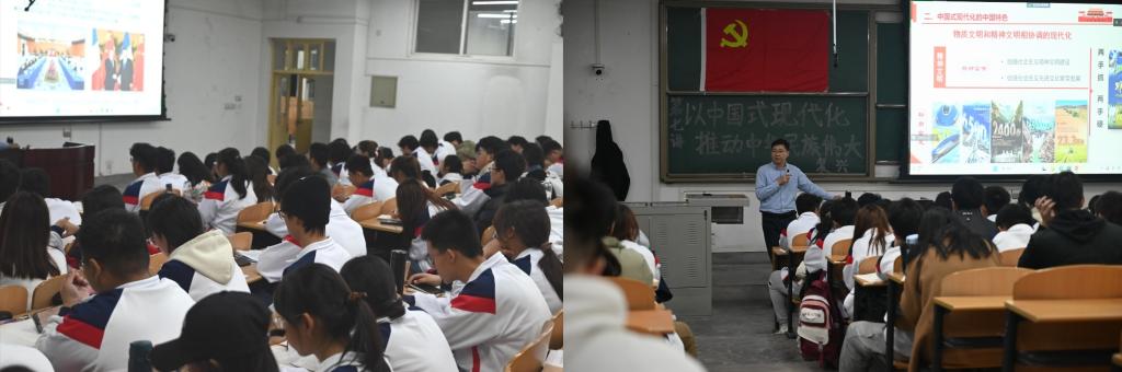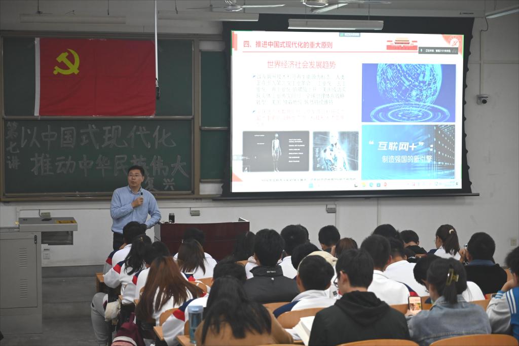 “從現(xiàn)在起,中國共產(chǎn)黨的中心任務就是團結(jié)帶領(lǐng)全國各族人民全面建成社會主義現(xiàn)代化強國、實現(xiàn)第二個百年奮斗目標,以中國式現(xiàn)代化全面推進中華民族偉大復興?!闭n堂上,王亮老師以習近平總書記在中共二十大報告中的這段話向?qū)W員們展開講授。中國式現(xiàn)代化是實現(xiàn)中華民族偉大復興的光明大道,王亮老師通過各種對比、舉例解說了中國式現(xiàn)代化的具體理念,中國式現(xiàn)代化是全體人民共同富裕的現(xiàn)代化;是物質(zhì)文明和精神文明相協(xié)調(diào)的現(xiàn)代化:人與自然和諧共生的現(xiàn)代化;走和平發(fā)展的現(xiàn)代化。隨后又具體講解了中國式現(xiàn)代化的九個本質(zhì)要求以及推動中國式現(xiàn)代化的重大原則:惟其艱巨,所以偉大,惟其艱巨,更顯榮光,讓學員們感悟頗深。王亮老師希望同學們要堅定理想信念,樹立遠大目標。認真學習,用知識武裝自己,提升個人素質(zhì),時刻關(guān)注國家政治形勢,堅定不移的跟隨黨的領(lǐng)導,將黨的二十大精神與日常生活相結(jié)合,時刻以黨員的標準要求自己,做好模范作用。