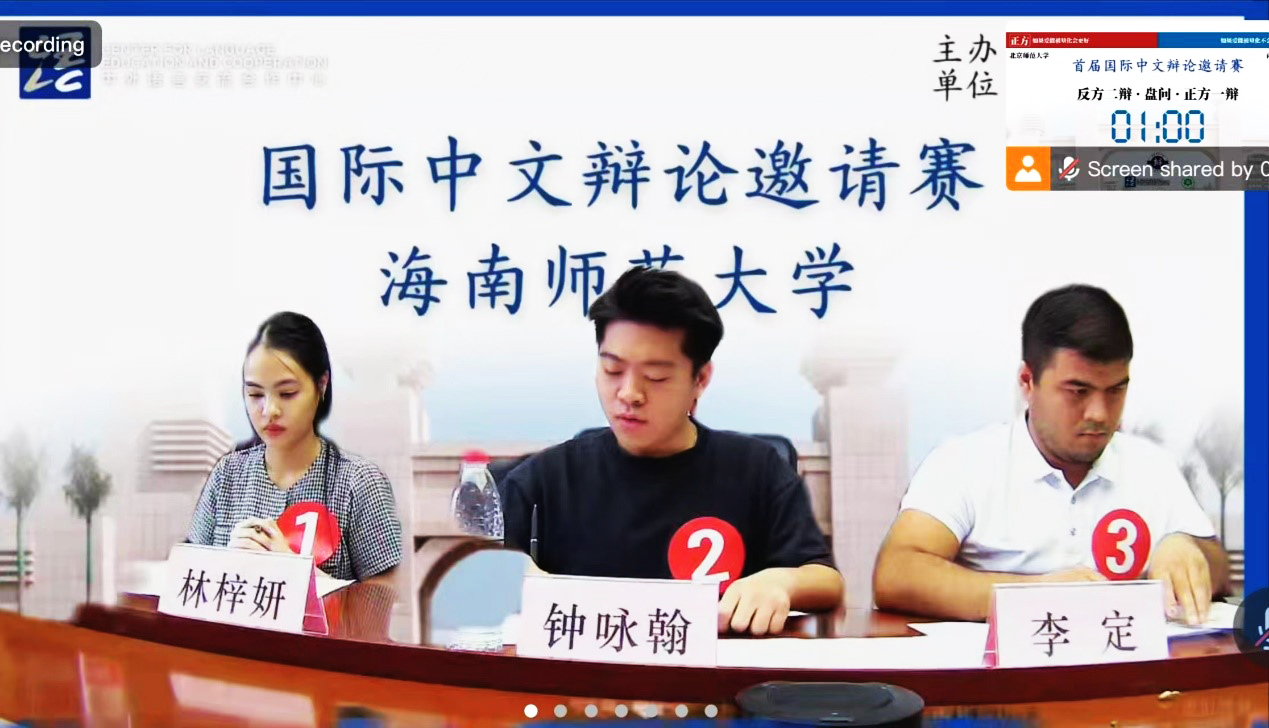 1028日上午,由教育部中外語言交流合作中心主辦,海南師范大學(xué)承辦的首屆國際中文辯論邀請賽預(yù)賽在線上舉行,包括北京師范大學(xué)、暨南大學(xué)、西南大學(xué)和我校在內(nèi)的全國二十所高校的國際學(xué)生代表隊受邀參賽。我校代表隊由2020級電子商務(wù)專業(yè)本科生鐘詠翰同學(xué)(馬來西亞)、2022級材料科學(xué)與工程專業(yè)碩士研究生李定同學(xué)(塔吉克斯坦)、2023級漢語國際教育碩士研究生林梓妍同學(xué)(泰國)組成。