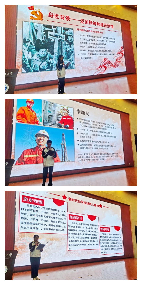 在“學子講鐵人”環(huán)節(jié),由高年級的郭容容、楊盛凱和黃一凡同學分別從鐵人身世背景、國內(nèi)國際戰(zhàn)略背景以及油田惡劣的自然環(huán)境分析了鐵人精神涵育的時代背景,從王進喜、王啟明和李新民的人物人物事跡講述了一脈相承的鐵人精神,從鐵人精神的重要意義、作用和傳播途徑分享了當代大學生對鐵人精神發(fā)揚的思考和感悟。并號召同學們在今后的學習生活中以鐵人精神為引領,將本次學習內(nèi)化于心、外化于行。