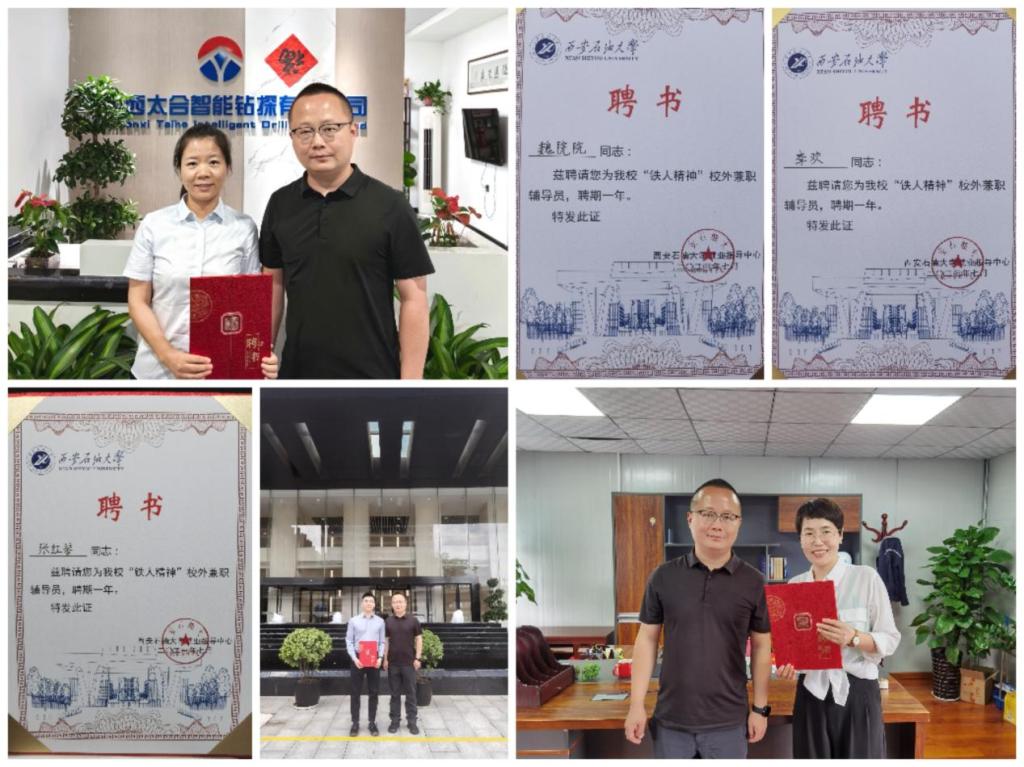 走訪期間,王剛分別與中鐵建工西安地鐵6號線項(xiàng)目書記張紅琴,正大集團(tuán)西北區(qū)財務(wù)總監(jiān)張鵬(2009級校友),陜西太合智能鉆探有限公司財務(wù)總監(jiān)李歡(2005級校友),陜西太合智能鉆探有限公司人力資源部長魏院院(2010級校友)進(jìn)行交流并頒發(fā)“鐵人精神”校外兼職輔導(dǎo)員聘書。