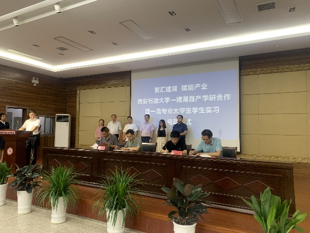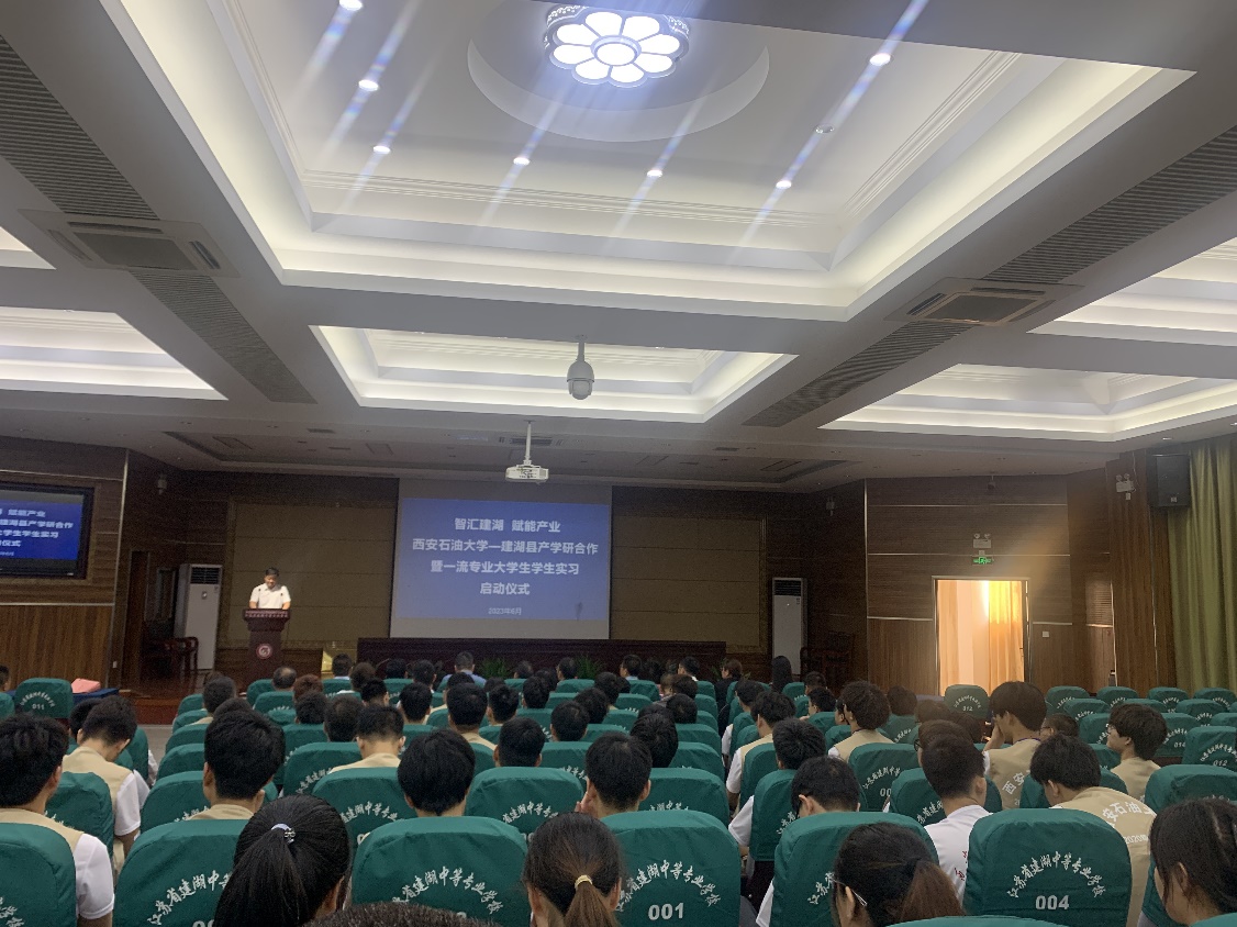 啟動儀式上,與會人員共同觀看了《建湖有戲》宣傳片;吳偉芳和曾令群分別就建湖縣引才政策和科技創(chuàng)新工作進行了推介宣講,同時誠摯邀請西石大畢業(yè)生們到建湖就業(yè)創(chuàng)業(yè);孫盤檜分別為蔡建文和林紅先頒發(fā)了“引才大使”證書;蔡建文和林紅先分別與鹽城中威機械有限公司等10家企業(yè)簽訂了產學研合作協(xié)議并進行了大學生實習基地授牌;企業(yè)代表鹽城中威機械有限公司董事長黃永中和實習生代表裝備2001班張嘉豪同學分別發(fā)言。