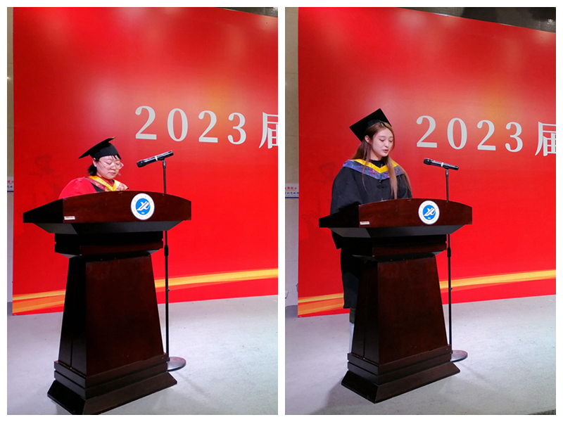 2023屆畢業(yè)生代表宋紫欣同學(xué)在發(fā)言中向多年來給予辛勤教誨的老師致以衷心的感謝和崇高的敬意,她回首四年求學(xué)時光的珍貴瞬間,從軍訓(xùn)、運(yùn)動會、文藝晚會到大學(xué)四年種種成功的喜悅與失敗的迷茫,那些與老師們、同學(xué)們相處的點(diǎn)點(diǎn)滴滴將是溫暖未來歲月的寶貴財富。她表示,作為一名新時代的青年,將永遠(yuǎn)不忘母校的辛勤栽培,感恩母校的培育和老師的辛勤指導(dǎo),并代表全體畢業(yè)生向母校保證,將謹(jǐn)記師長教誨,秉承“好學(xué)力行,自強(qiáng)不息”的校訓(xùn),為祖國富強(qiáng)和民族復(fù)興而不懈奮斗。