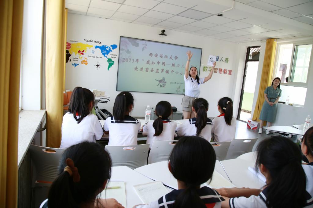 在直羅小學(xué),留學(xué)生們?yōu)樾W(xué)生們帶來(lái)了有趣生動(dòng)的英語(yǔ)口語(yǔ)課。實(shí)踐教學(xué)活動(dòng)是“感知中國(guó)”活動(dòng)重要組成部分,在互動(dòng)課堂上,小學(xué)生們與來(lái)自不同國(guó)家的留學(xué)生互動(dòng)交流,來(lái)自馬來(lái)西亞的詠翰分別用中文、英文、馬來(lái)西亞語(yǔ)給小學(xué)生們教了生日祝福歌,來(lái)自哈薩克斯坦的小云用圖畫(huà)、猜謎游戲?yàn)樾W(xué)生們上了一堂生動(dòng)活潑的英語(yǔ)課。有趣的英語(yǔ)課堂激發(fā)了小學(xué)生學(xué)習(xí)英語(yǔ)的熱情和濃厚的興趣,課堂氣氛熱烈,同學(xué)們發(fā)言踴躍,一節(jié)課下來(lái)小學(xué)生們意猶未盡。英語(yǔ)課堂外,是以“傳播快樂(lè)足球”為主題的足球互動(dòng)活動(dòng),留學(xué)生與小學(xué)生們開(kāi)展了一場(chǎng)足球友誼賽。場(chǎng)上,參賽隊(duì)員們齊心協(xié)力,奮勇拼搏。帶球、護(hù)球、傳球、射球,動(dòng)作嫻熟,拼勁十足。就這樣,初次來(lái)到直羅小學(xué)的留學(xué)生們感受到了當(dāng)?shù)氐娘L(fēng)土人情,并對(duì)接下來(lái)與孩子們的相遇充滿了期待。活動(dòng)中,我校專程為直羅小學(xué)帶去了50本捐贈(zèng)圖書(shū)和5個(gè)嶄新足球。