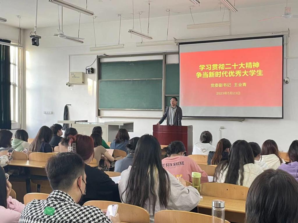 為深入開(kāi)展學(xué)習(xí)貫徹習(xí)近平新時(shí)代中國(guó)特色社會(huì)主義思想主題教育,5月23日晚19點(diǎn),外國(guó)語(yǔ)學(xué)院黨委副書(shū)記王業(yè)青在鄠邑校區(qū)B203為外國(guó)語(yǔ)學(xué)院全體黨員講授“學(xué)習(xí)貫徹黨的二十大精神,爭(zhēng)當(dāng)新時(shí)代優(yōu)秀大學(xué)生”主題黨課,全院100余名學(xué)生黨員參加了此次黨課學(xué)習(xí)。