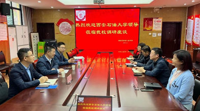 在授牌儀式前,與西安市第四十五中學(xué)黨支部書記王金暉、校長莫荻、副校長王玫、教導(dǎo)處主任王曉菲進行了深入交流座談。龐秉謙書記介紹了西安石油大學(xué)歷史沿革和發(fā)展概況,并對學(xué)校辦學(xué)特色、學(xué)科優(yōu)勢、特色專業(yè)、校園文化、招生政策等方面的情況進行了詳細的講解,并一同觀看了“西安石油大學(xué)建校70周年宣傳片”。