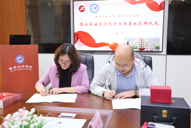 會(huì)上,田虹霞代表學(xué)校與西安太白學(xué)校簽署了《西安石油大學(xué)優(yōu)秀生源基地建設(shè)協(xié)議》,并授予“優(yōu)秀生源基地”牌匾。