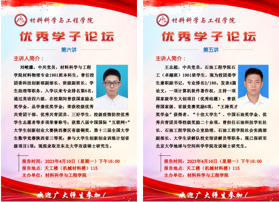 “優(yōu)秀學子論壇”作為材料科學與工程學院加強學風建設的重點系列活動,本學期將定期在全校范圍內(nèi)邀請優(yōu)秀學子進行分享交流,從而不斷激勵廣大學生向優(yōu)秀看齊,明確奮斗目標,朝著自己的理想,不負韶華,砥礪前行!