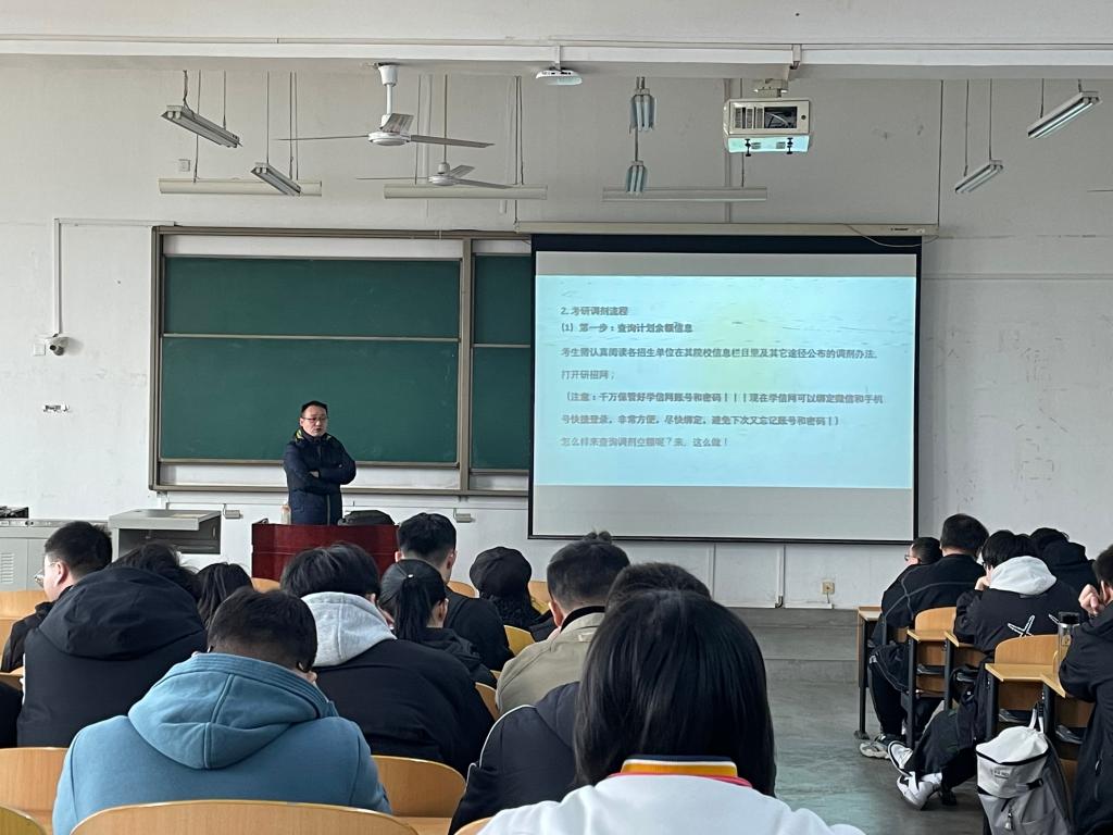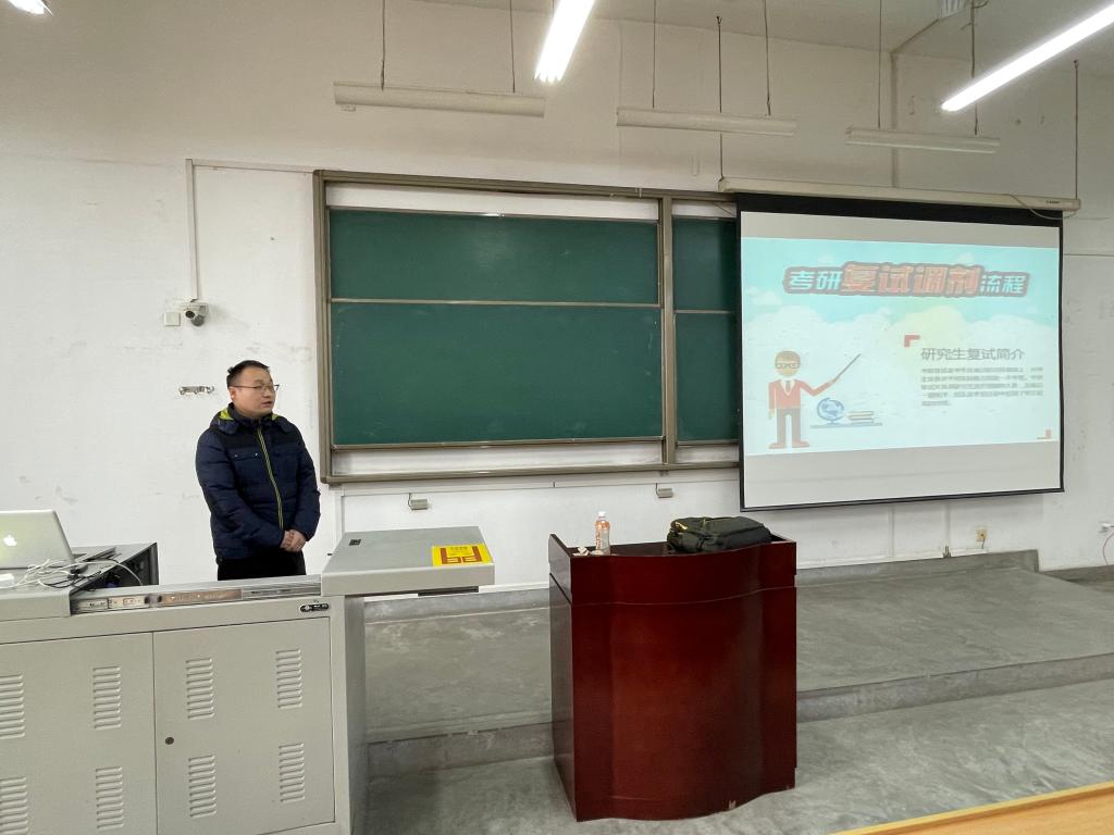 于恒老師結合考研學生的成績分布,從報考院校特點、考研形勢、復試流程、面試技巧和志愿調(diào)劑等五個方面向大家做了詳細的講解。他強調(diào),第一,要把握時間節(jié)點,通過所報考學校的研究生招生網(wǎng)和所報考學院官網(wǎng)的研究生招生信息欄目了解復試錄取實施細則,充分做好復試準備;第二,積極拓寬信息渠道,通過郵件、短信和電話等方式主動聯(lián)系意向導師,向研究生師兄師姐請教如何做好復試準備;第三,有調(diào)劑意愿的學生要積極關注調(diào)劑信息,做好心理調(diào)適、面試禮儀等工作,積極通過各種信息渠道及時了解校內(nèi)外的調(diào)劑公告。在現(xiàn)場答疑環(huán)節(jié)中,于恒老師對學生提出的問題逐一解答,結合學生實際情況有針對性地給予相應的建議,使學生對復試和調(diào)劑工作有更加深入地了解。