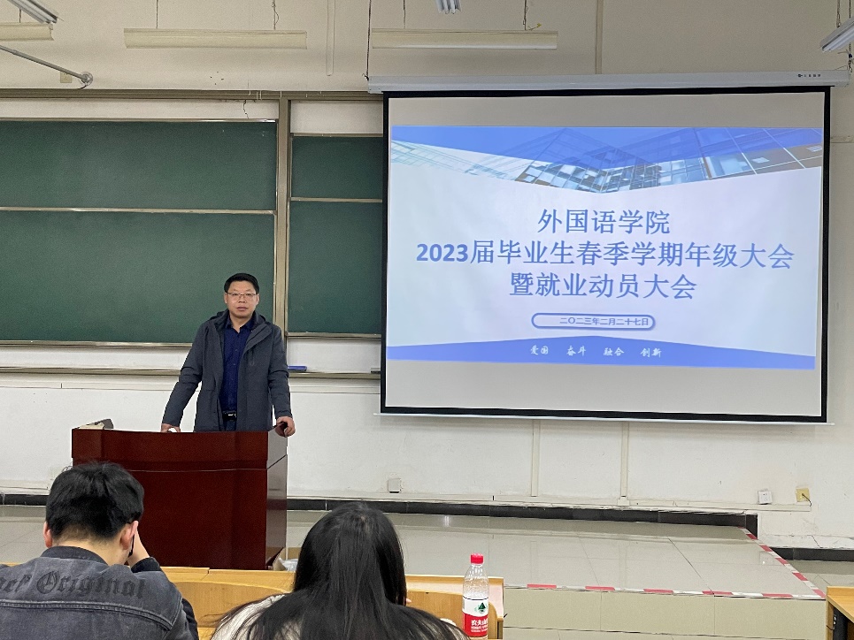 院黨委副書記王業(yè)青梳理了各年級本學期的重點工作和主要任務,介紹了學院專四專八考試、考研和就業(yè)等情況,并結合各年級實際情況強調(diào),2019級學生要結合自身實際,合理安排好學業(yè)、實習就業(yè)、考研復試等各類考試事宜,樹立正確的就業(yè)觀、擇業(yè)觀,認清就業(yè)形勢,搶抓就業(yè)機會,認真做好畢業(yè)前的各項準備工作;2020級學生要積極參加各類科研競賽,認真準備專四考試,提前做好考研、就業(yè)準備;2021級學生要做好學業(yè)規(guī)劃,設立階段目標,嚴格遵守學校和學院的各項管理規(guī)定,增強安全防范意識和自我防護能力,保持良好的個人衛(wèi)生和生活習慣;2022級學生要高度重視第一課堂學習、第二課堂綜合素質(zhì)培養(yǎng),強化班級和宿舍建設,主動適應變化,提升獨立自主和溝通交往能力,提高個人禮儀修養(yǎng),加強體育鍛煉,珍惜時間,充實大學學習生活。