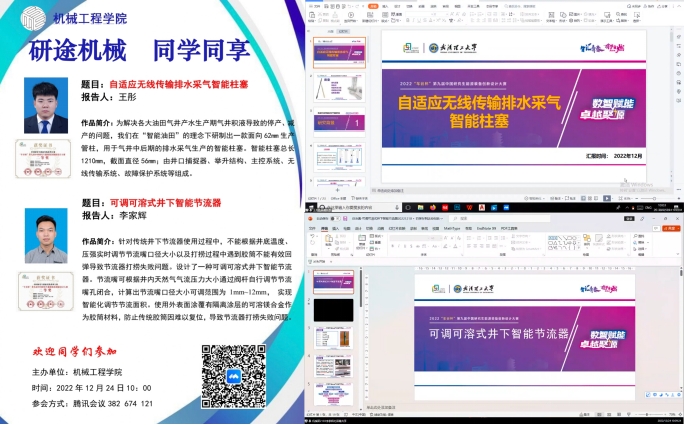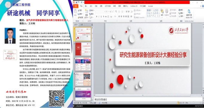 20221224“車谷杯”第九屆中國(guó)研究生能源裝備創(chuàng)新設(shè)計(jì)大賽獲獎(jiǎng)?wù)咄跬⒗罴逸x和王歡暢分別分享了自己的設(shè)計(jì)成果、經(jīng)驗(yàn)與心得,會(huì)后就同學(xué)們提出的問題做出解答,為同學(xué)們下一步參賽作參考。