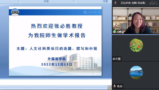 為進一步做好人文社科基金項目申報組織工作,提高國家社科基金項目及其他基金項目的申報質(zhì)量,外國語學院于12月15日下午15:30,特別邀請貴州師范大學教授、博士生導(dǎo)師張必勝教授開展了題為“人文社科類項目的選題、撰寫和發(fā)表”的線上專題講座。外國語學院全體教師、全體翻譯碩士研究生共200余人在線參加了本次講座,講座由劉輝副院長主持。