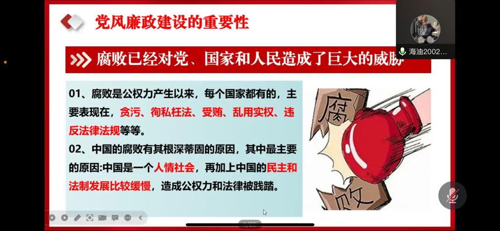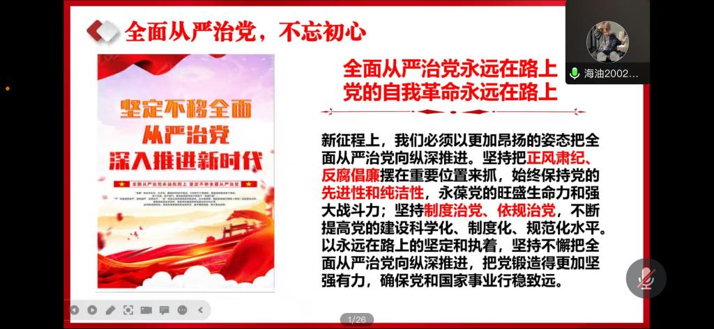 梁美玉:本次活動(dòng)不管是視頻中黨對(duì)腐敗分子的絕不姑息還是同學(xué)們對(duì)黨內(nèi)腐敗現(xiàn)象的義憤填膺,都讓我意識(shí)到全面從嚴(yán)治黨是馬克思主義政黨的鮮明品格,是百年大黨風(fēng)華正茂的奧秘所在,是實(shí)現(xiàn)中華民族偉大復(fù)興的根本保證。