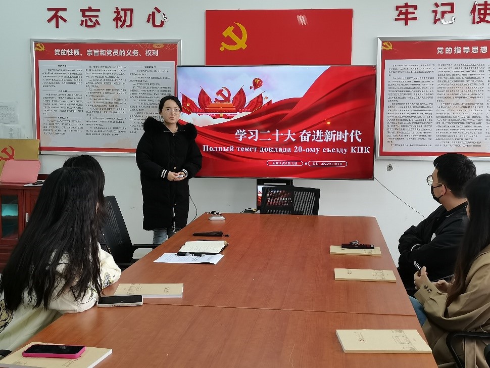 支部黨員沈九薇表示:Какмолодойчеловекновойэпохи,мыдолжнытвердослушатьпартийныеслова,идтиспартией,чтобыбытьсмелымихорошимимолодымилюдьминовойэпохи,чтобысделатьидеал,чтобывзятьнасебясмелость,чтобысъестьтрудности,чтобымолодыелюдивполноймересозидатьсовременноесоциалистическоегосударствонапрактике.(作為新時(shí)代青年,我們要堅(jiān)定不移聽黨話、跟黨走,立志做有理想、敢擔(dān)當(dāng)、能吃苦、肯奮斗的新時(shí)代好青年,讓青春在全面建設(shè)社會(huì)主義現(xiàn)代化國(guó)家的火熱實(shí)踐中綻放絢麗之花。)