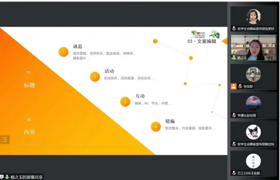 楊之玉以《團屬新媒體平臺編輯與策劃》為題,從思維導向、內容策劃、文案編輯、實用工具等四個方面向大家講述了做好團屬新媒體的要求與方式方法,指出從事新媒體工作需要具備積累、膽大、心細三個要素,特別是要在日常學習與工作中積累豐富素材,勇于實踐,為新媒體創(chuàng)作提供堅實保障。最后,針對同學們關心的話題選取、文字撰寫、設計制作、圖片選用、美編排版等方面的問題進行了詳細的解答。整個講座過程中同學們認真聆聽,積極在評論區(qū)與老師互動,培訓過程氣氛熱烈。