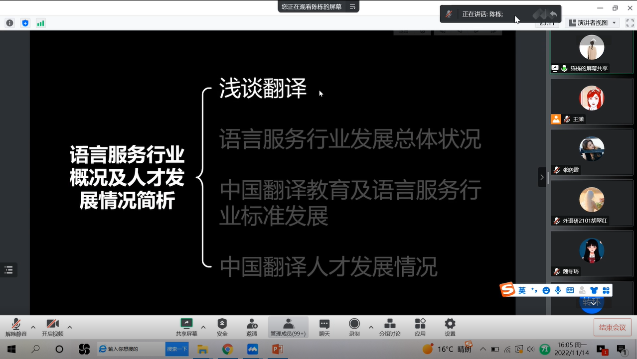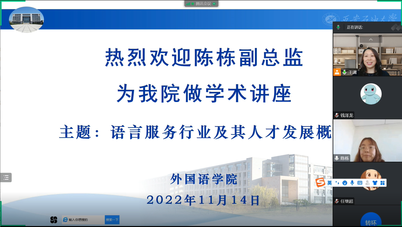 為進一步做好2023屆畢業(yè)生就業(yè)創(chuàng)業(yè)工作,加強學(xué)生就業(yè)指導(dǎo),強化就業(yè)育人實效,提高翻譯碩士研究生的職業(yè)素養(yǎng),幫助學(xué)生了解語言服務(wù)行業(yè)的基本現(xiàn)狀,引導(dǎo)學(xué)生從實際出發(fā)選擇職業(yè)和崗位,做好職業(yè)規(guī)劃。11月14日下午,外國語學(xué)院邀請中譯語通(陜西)科技有限公司語言服務(wù)事業(yè)群陳棟副總監(jiān),為我校MTI全體研究生作題為“語言服務(wù)行業(yè)及其發(fā)展概況”的線上專題講座。外國語學(xué)院MTI全體研究生100余人參加講座,講座由副院長劉輝主持。