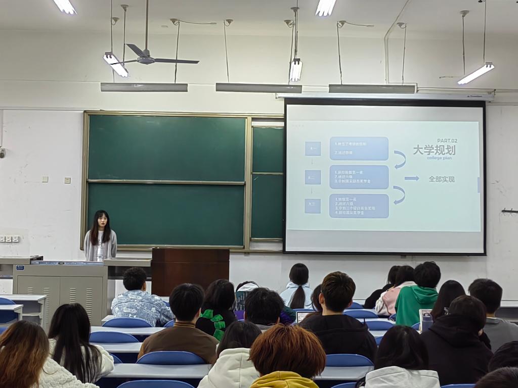 相凱馨同學(xué)從個(gè)人情況、大學(xué)規(guī)劃、學(xué)習(xí)經(jīng)驗(yàn)等方面與大家分享自己的經(jīng)歷。她鼓勵(lì)同學(xué)們要多嘗試,走出自己的舒適圈,開(kāi)發(fā)自己的潛能,發(fā)現(xiàn)自己的閃光點(diǎn)。對(duì)于學(xué)習(xí),要多閱讀作品,將復(fù)習(xí)重點(diǎn)放在專業(yè)課的課本上,并從四六級(jí)方面分享自己對(duì)大家的建議,希望大家能夠重視。對(duì)于大學(xué)競(jìng)賽,要多開(kāi)展、精開(kāi)展,從競(jìng)賽中不斷提高自身的能力。