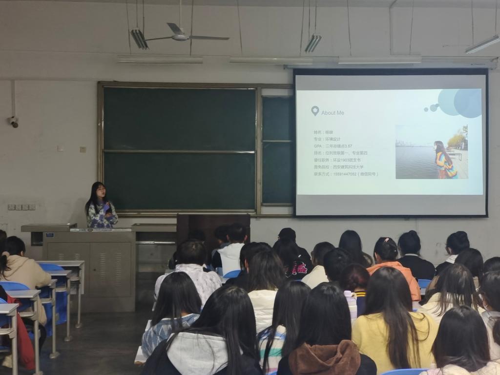 辛怡萱同學(xué)向同學(xué)們?cè)敿?xì)講解了保研推免的資格獲取要求,以及多種保研方法,很詳細(xì)地將準(zhǔn)備資料、院校面試、確定錄取各個(gè)時(shí)間段中的問(wèn)題進(jìn)行解釋,期間不斷回應(yīng)同學(xué)們的疑惑。希望同學(xué)們懂得利用學(xué)校資源,從而彌補(bǔ)自己的不足。最后她特別強(qiáng)調(diào)了設(shè)計(jì)類專業(yè)英語(yǔ)四級(jí)的重要性,并將自己學(xué)習(xí)四級(jí)的應(yīng)試技巧進(jìn)行了分享。