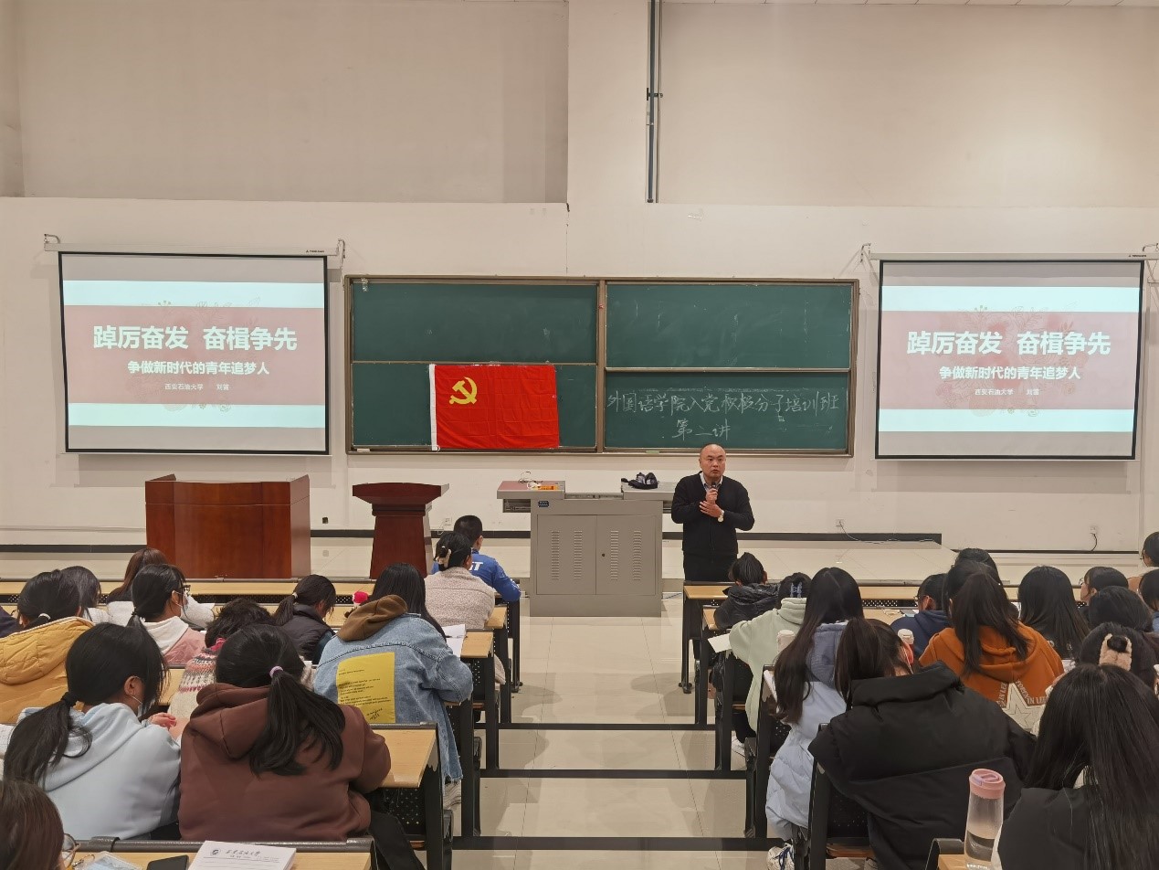 青年強(qiáng),則國(guó)家強(qiáng)。劉笛在講授中談到,黨的二十大報(bào)告指出:“廣大青年要堅(jiān)定不移聽黨話、跟黨走,懷抱夢(mèng)想又腳踏實(shí)地,敢想敢為又善作善成,立志做有理想、敢擔(dān)當(dāng)、能吃苦、肯奮斗的新時(shí)代好青年”,青年是國(guó)家的未來,我們青年一代應(yīng)堅(jiān)定理想信念,練就過硬本領(lǐng),錘煉高尚品質(zhì)。他要求同學(xué)們要深刻理解中國(guó)共產(chǎn)黨員的意義,要從思想深處明確自己向黨組織遞交入黨申請(qǐng)書的動(dòng)力所在,要以“為同學(xué)服務(wù)、為班級(jí)做貢獻(xiàn)、為學(xué)校爭(zhēng)榮譽(yù)、為國(guó)家富強(qiáng)”作為新時(shí)代大學(xué)生在大學(xué)校園時(shí)的奮斗目標(biāo),正確的認(rèn)識(shí)時(shí)代責(zé)任和歷史使命,要謹(jǐn)記校風(fēng)校訓(xùn),爭(zhēng)取做一名優(yōu)秀的“四實(shí)一新”西安石油大學(xué)大學(xué)生。劉笛結(jié)合我院英語、翻譯和俄語專業(yè)的培養(yǎng)目標(biāo),以獲得國(guó)家獎(jiǎng)學(xué)金的優(yōu)秀同學(xué)為例,鼓勵(lì)同學(xué)們不斷提升自己的專業(yè)水平,之外還要利用課后時(shí)間努力提升自身綜合素質(zhì),切實(shí)成為一名能為國(guó)家做貢獻(xiàn)的外語人才。最后,他從人類情懷、家國(guó)情懷、石油情懷和班級(jí)情懷出發(fā),對(duì)全體學(xué)生提出四點(diǎn)希望,一是要陶冶情操,勤學(xué)修德,求真向善,誠(chéng)信友愛。二是要主動(dòng)學(xué)習(xí),勤學(xué)善思;創(chuàng)新學(xué)習(xí),積極實(shí)踐。三是要做有心人,干困難事,立大格局。四是要珍惜韶華,不負(fù)青春,敢立潮頭,奮發(fā)有為。