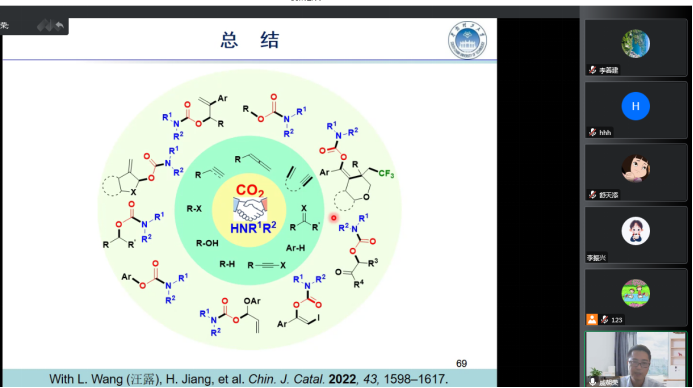 戚朝榮校友2004年畢業(yè)于我?;瘜W化工學院并取得碩士學位,主要研究方向為二氧化碳化學轉化與利用,近年來在該領域取得了豐碩的研究成果。氨基甲酸酯是一類重要的化合物,是很多具有生物活性的天然產(chǎn)物的基本結構單元,在醫(yī)藥、農(nóng)藥和有機合成等領域得到廣泛應用。傳統(tǒng)合成氨基甲酸酯的方法使用光氣等有毒原料,容易引起健康風險及環(huán)境污染。本次報告,戚朝榮教授介紹了其團隊利用二氧化碳替代光氣,在過渡金屬催化或無金屬催化條件下實現(xiàn)了二氧化碳與胺和其它化合物,包括腙、二芳基碘鎓鹽、酮、芳基硼酸、聯(lián)烯基醚、芳炔或重氮酸酯等多組分反應,構建出系列氨基甲酸酯類化合物,為合成有用的氨基甲酸酯化合物提供了簡便高效的途徑。