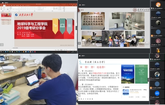 為進(jìn)一步激發(fā)2019級(jí)學(xué)生的考研熱情,10月13日,地球科學(xué)與工程學(xué)院舉辦了線上考研經(jīng)驗(yàn)交流會(huì)。邀請(qǐng)了6位畢業(yè)于地科院現(xiàn)就讀于中國(guó)地質(zhì)科學(xué)院、中南大學(xué)、長(zhǎng)安大學(xué)、西南石油大學(xué)、中國(guó)石油大學(xué)(北京)和昆明理工大學(xué)的2017級(jí)和2018級(jí)優(yōu)秀學(xué)長(zhǎng)進(jìn)行了交流分享。學(xué)院全體學(xué)工干部及2019級(jí)學(xué)生參加了此次交流會(huì)。