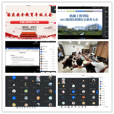 為切實做好國慶假期學生的安全教育、管理服務相關工作,根據(jù)《關于做好國慶假期有關工作的通知》(學工函〔2022〕22 號)和《關于做好國慶假期有關工作的通知》(西石大研工函〔2022〕22 號)的相關工作安排,結合疫情防控要求,9月29日至30日,機械工程學院本科生和研究生分年級分校區(qū)通過線上+線下相結合的方式開展學生干部、年級大會等國慶節(jié)假期安全教育工作。