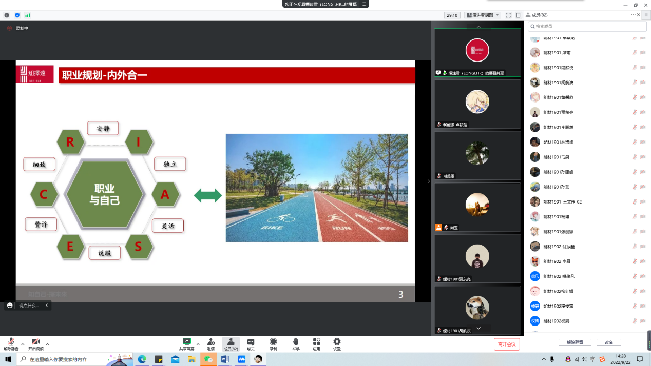 吳經(jīng)理從職業(yè)規(guī)劃的意義、就業(yè)的多種選擇、職業(yè)與人格類型的匹配、就業(yè)準備、職業(yè)了解、實施計劃、應聘準備和面試提升等方面展開講座。他強調,要做好職業(yè)規(guī)劃首先要有清晰的自我認知,在了解自己的性格、情商等個性心理特征和能力優(yōu)長后,選擇一份與自己個性能力相匹配的職業(yè)或工作,實現(xiàn)自洽并自如。接著,吳經(jīng)理針對大學生在職業(yè)生涯的不同階段,從不同角度提供了建設性建議。最后,他向同學們介紹了隆基綠能股份有限公司近年來的發(fā)展,包括在施項目、投資領域、人才體系等,并舉出幾個典型成長案例,以此鼓勵在座同學充滿自信,勇于嘗試。