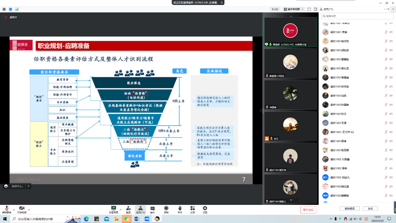為加強學生對當前就業(yè)形勢的了解,進一步明晰職業(yè)生涯規(guī)劃對個人成長的重要意義,助力高質量就業(yè),9月22日上午,新能源學院職業(yè)規(guī)劃和就業(yè)指導講座在線上舉行,學院特邀隆基綠能股份有限公司招聘管理部招聘經(jīng)理吳三林擔任主講,學院2019級,2020級學生及各系教師代表參加,講座由新能源材料與器件專業(yè)負責人肖美霞副教授主持。