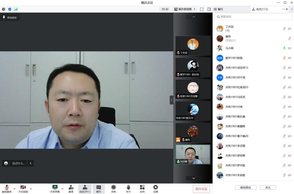 9月21日下午,理學(xué)院通過騰訊會(huì)議方式在線召開了2019級(jí)年級(jí)大會(huì)暨考研就業(yè)推進(jìn)會(huì)。理學(xué)院黨委副書記馬小剛、學(xué)生工作辦公室主任丁亦喆、輔導(dǎo)員康偉參會(huì)并發(fā)言。學(xué)院2019級(jí)全體學(xué)生參會(huì),2019級(jí)學(xué)生輔導(dǎo)員康偉主持。