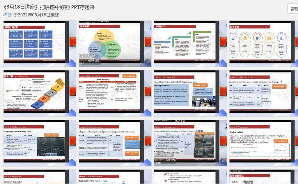 大學(xué)外語教學(xué)一部根據(jù)教學(xué)部所承擔(dān)的教學(xué)任務(wù)特點,教師個人發(fā)展需求,以及院校特色選取了研修班和論壇日程安排中部分講座作為必修內(nèi)容,如“高質(zhì)量發(fā)展背景下一流課程建設(shè)理念與實施路徑”、“智慧賦能:打造WE外語教育的共同未來”、“文明互鑒:高校外語教師中外人文素養(yǎng)提升”、“外語課程思政的縱深推進:人才培養(yǎng)的目標、理念與路徑”、“學(xué)科智慧教室環(huán)境下的新型課堂教學(xué)模式創(chuàng)新與實踐云專題”等,要求全體教師認真學(xué)習(xí),互相交流學(xué)習(xí)心得,并在教學(xué)部工作群中建立了相應(yīng)的講座資料群相冊,留存講座重要內(nèi)容,以供后期查閱學(xué)習(xí)。同時,大外教學(xué)一部也鼓勵教師們根據(jù)自己的教研興趣選修研修班和論壇日程中其它講座內(nèi)容。