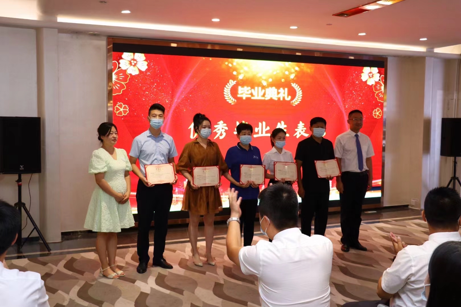 畢業(yè)典禮最后,為每一位畢業(yè)生頒發(fā)了畢業(yè)證書,全體師生合影留念。