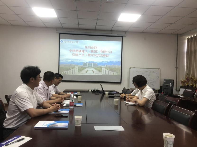6月25日下午,中建新疆建工集團第五建筑工程有限公司人力資源部主管陳偉、陜西分公司總工程師魯勃一行來我校走訪交流,土木工程學院黨委書記陳濤、副院長李俊亭、副院長崔瑩及辦公室副主任馬寧馨出席會議。座談會由李俊亭副院長主持。