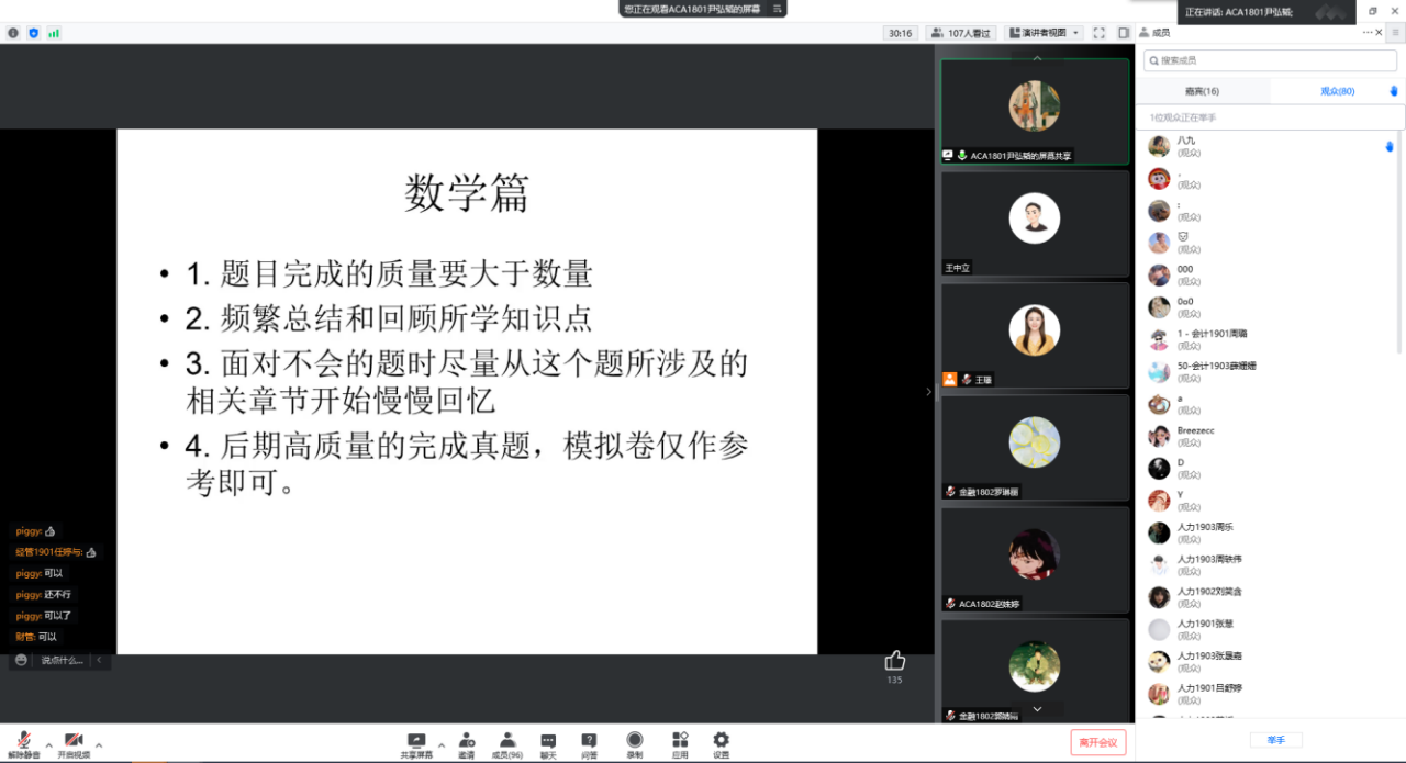 會議首先由輔導(dǎo)員王中立進(jìn)行考研動員介紹,就當(dāng)前畢業(yè)生所面臨的考研形勢進(jìn)行分析,并鼓勵大家堅(jiān)定考研信心,科學(xué)選擇目標(biāo),潛心復(fù)習(xí)備考,爭取順利上岸。18位優(yōu)秀考研畢業(yè)生代表依次進(jìn)行經(jīng)驗(yàn)分享,他們從自身考研經(jīng)歷出發(fā),圍繞如何選取院校專業(yè)、制定復(fù)習(xí)計(jì)劃、調(diào)整備考心態(tài)以及復(fù)試中的注意事項(xiàng)等方面進(jìn)行交流,并著重介紹了考研英語和數(shù)學(xué)科目的學(xué)科特點(diǎn)、知識難點(diǎn)、考試重點(diǎn)、復(fù)習(xí)要點(diǎn),并建議大家在備考途中要以堅(jiān)持不懈的恒心、持之以恒的耐心、百折不撓的信心去面對挫折與挑戰(zhàn),要培養(yǎng)總結(jié)知識的歸納能力,對待錯題、難題、偏題要及時(shí)進(jìn)行分類整理與鞏固,日積月累、有效提高。輔導(dǎo)員王璟和王中立對本次考研經(jīng)驗(yàn)交流分享會表示肯定與支持,同時(shí)強(qiáng)調(diào)備考同學(xué)要以充足的信心、飽滿的熱情、科學(xué)的方法、合理的計(jì)劃對待艱苦奮斗的考研之路,相信大家通過努力終將實(shí)現(xiàn)夢想。