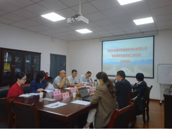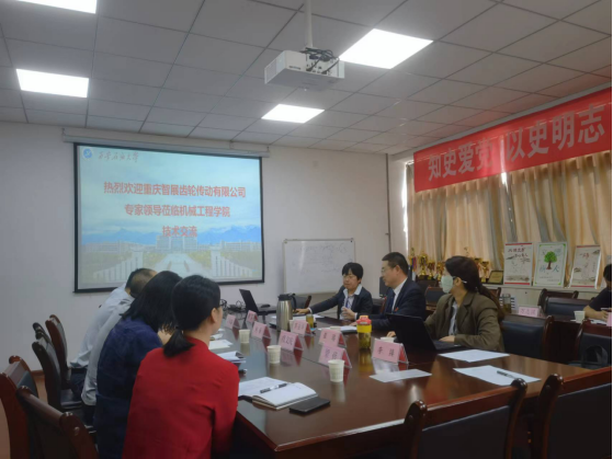 竇益華院長首先對何榮校友一行來校表示熱烈歡迎,并詳細說明了學(xué)院組織架構(gòu)和科研業(yè)績,重點舉例近兩年與企業(yè)戰(zhàn)略合作成果。何榮校友代表智展齒輪介紹了公司的發(fā)展歷程,列舉了所取得的多項國內(nèi)領(lǐng)先技術(shù)成果,以及公司的發(fā)展方向。學(xué)院副院長崔璐重點介紹學(xué)院在機械傳動、故障診斷、疲勞損傷、傳質(zhì)傳熱等方向的研究進展,以及與西安交通大學(xué)、西北工業(yè)大學(xué)等院校合作開發(fā)成果。智展公司江師露主任則展示了公司的主要產(chǎn)品及應(yīng)用案例,并且提出部分待解決的技術(shù)難題。陳兵教授當(dāng)場對公司提出的部分問題進行了初步分析,并且與幾位年輕教師一起展開討論,與來訪技術(shù)專家就高速齒輪箱傳動和常見故障進行了深入交流。